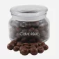 Pot en verre pour patio. Rempli de cacahuètes enrobées de chocolat. Emballé en vrac. 3,875" de largeur x 3,75" de hauteur.