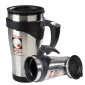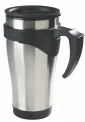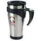 Ce mug thermique en acier inoxydable est doté d'une poignée en plastique noir, d'un intérieur en résine, d'un couvercle anti-éclaboussures et d'une ouverture à glissière sur le couvercle. 16 oz / 470 ml. 3 3/8" de diamètre x 6 3/4" de hauteur.