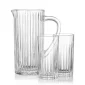 La carafe Bacchus en cristal sans plomb présente un design contemporain avec des rainures verticales qui entourent la carafe et les verres. Une gravure profonde en option peut être réalisée sur la base.