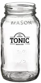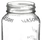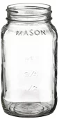Bocal Mason de 24 oz. Il présente une forme carrée, du verre en relief et le nom "MASON" en relief autour du haut du bocal. Deux côtés joints en relief avec des marques de mesure de pinte. Lavage à la main recommandé. 6,5" H x 3,42" de diamètre.