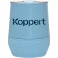 Gobelet thermique double paroi en acier inoxydable 18/8 de 12 oz avec isolation sous vide en cuivre, couvercle à pression, fermeture pivotante assortie et base en silicone amovible. Boîte cadeau individuelle. Lavage à la main recommandé. Ne pas mettre au micro-ondes. Conforme à la FDA, Prop 65. 4,75" H x 3,625" L.
