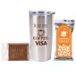 Gobelet sous vide en acier inoxydable de 20 oz. avec pack de café gourmet et un cookie rectangle au chocolat. Isolation sous vide à double paroi. Sans BPA. Garde les boissons froides pendant 24 heures ou chaudes pendant 6 heures. Construction en acier inoxydable avec doublure intérieure en acier inoxydable. Couvercle à action coulissante résistant aux fuites avec joint d'étanchéité. Pack de café gourmet d'une tasse avec étiquette couleur pleine. Le pack de café est disponible en or ou en argent. Cookie rectangle avec moule standard (Merci ou Joyeuses Fêtes) ou vierge. 7" H x 3,5" de diamètre.