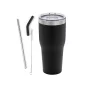 Gobelet isolé sous vide à double paroi de 30 oz avec paille en acier inoxydable. Acier inoxydable revêtu de poudre 18/8 avec doublure en cuivre; couvercle transparent en AS; paille en acier inoxydable de qualité alimentaire 18/8 avec embout en silicone détachable pour un nettoyage facile; brosse de nettoyage de paille incluse; s'adapte aux porte-gobelets standard. Ne convient pas au micro-ondes; lavage à la main uniquement. Emballé dans une boîte de vente au détail. Garde les boissons chaudes et froides plus longtemps! 8,6" H x 4,125" de diamètre.