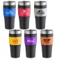 Gobelet isolé à double paroi de 16 oz; corps noir avec panneau métallique de couleur vive; couvercle en acier inoxydable avec verrou coulissant pour éviter les renversements; fond antidérapant. Ne pas mettre au micro-ondes ni au lave-vaisselle. 7 5/16" H x 3 3/8" de diamètre.
