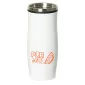 Gobelet en acier inoxydable à double paroi avec isolation sous vide et un anneau en silicone noir. Contient jusqu'à 400 ml (13,5 oz). Emballé individuellement. Conforme à la FDA et sans BPA. Couvercle à vis en PP. Couvercle à ouverture/fermeture par bouton-poussoir. Étanche. Poignée de transport avec mousqueton. Conforme à la FDA, Prop 65. 8,25" H x 2,5" de diamètre.