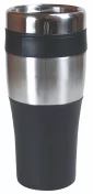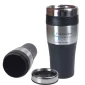 Ce gobelet thermique noir est doté d'une large bande en acier inoxydable, d'une extérieur et intérieur en résine synthétique ainsi que d'un couvercle vissé anti-éclaboussures avec un onglet coulissant. Capacité : 14 oz / 415 ml. Boîte individuelle. Conforme à la FDA. 3 1/4" de diamètre x 7 3/8" de hauteur.