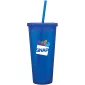 Gobelet acrylique double paroi de 20 oz avec couvercle vissé et paille souple assortie. Lavage à la main recommandé. Ne pas mettre au micro-ondes. Conforme à la FDA, Prop 65. 8,125" H x 4,125" L.