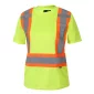 Polyester 100% séchage rapide. Manches courtes. Poche poitrine. Deux sangles de fixation pour radio sur la poitrine. Deux bandes réfléchissantes verticales à l'avant du t-shirt. Deux bandes réfléchissantes à l'arrière du t-shirt formant un "X". Une bande réfléchissante à la taille. Double couture sur la bande réfléchissante argentée et sur la bande jaune. Conforme à la norme CSA.