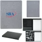 Portfolio de taille senior avec une couverture en tissu semblable au lin chiné et un bloc-notes de 60 feuilles lignées. Comprend une boucle de stylo intérieure ; des poches pour cartes et documents ; et une reliure élastique pour organiser les appareils et les câbles. Boîte cadeau mate noire élégante incluse. 12 1/16" H x 9 1/4" L x 1" P