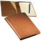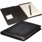 Ce portfolio en cuir pleine fleur suédé est orné de surpiqûres sur le pourtour. Il comprend un bloc-notes ligné de 5"x8" avec environ 40 feuilles. Conforme à la proposition 65. 5,75" L x 8,875" H x 0,25" P