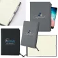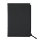 Cahier durable en 600D avec une grande poche avant zippée. Comprend un cahier relié remplaçable de 80 feuilles lignées avec section pour remplir la date et une boucle élastique assortie pour le stylo. 6" L x 8.625" H
