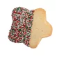 Ravissez tout le monde sur votre liste de cadeaux avec ces délicieux biscuits au beurre de Noël. Les biscuits au beurre en forme d'étoile sont trempés à moitié dans du chocolat au lait et recouverts de paillettes festives de Noël. Tous les biscuits sont emballés individuellement avec une étiquette en couleur pleine de 2"x2", entièrement personnalisable. Les biscuits ont une durée de conservation de 6 mois. 5" L x 3 1/4" H