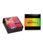 Ce cadeau tendance ne manquera pas de faire tourner les têtes et de laisser bouche bée. Mettez en valeur votre message sur le couvercle avec une bande ventrale en couleur et ouvrez la boîte pour révéler 5 cubes acryliques avec des étiquettes en couleur alternées. Comprend 1 boîte de taffy à l'eau salée, 1 boîte de Jelly Belly® jelly beans, 1 boîte de boutons en chocolat et 1 boîte de bonbons acidulés aux fruits. La zone d'impression en pleine page sur le cube est de (8 1/8" de largeur x 2 1/8" de hauteur). Choisissez jusqu'à deux couleurs de Jelly Belly beans ou assorties. Conforme à la CFIA, la FDA, la SQF. 5.5625" L x 5.5625" l x 2.125" H.