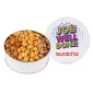 Boîte en étain remplie de popcorn au caramel, de cacahuètes grillées au miel et de mélange de noix salées. 7 1/8" de largeur x 2 1/2" de hauteur