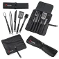 Ensemble d'ustensiles de barbecue en six pièces comprenant : des pinces extra-longues à ressort, une fourchette à deux dents longue, un couteau à découper de 11 pouces, une spatule extra-large avec un bord dentelé, et un outil de nettoyage avec des poils en laiton. Emballé dans une pochette enroulable facile à nettoyer avec fermeture à boucle. Tous les outils sont dotés d'un revêtement résistant aux rayures. 18 3/4" L x 5 1/2" W