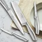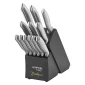 Lames en acier inoxydable exceptionnellement tranchantes et creuses. Poignées en acier inoxydable conçues pour le confort. L'ensemble comprend un couteau à trancher de 8 pouces, un couteau Santoku de 7 pouces, un couteau à désosser de 6 pouces, un couteau utilitaire de 5 pouces, (6) couteaux à steak de 4,5 pouces, un couteau d'office de 3,5 pouces, un aiguiseur de lame et un bloc à couteaux en pin noir. Lavage à la main recommandé. Garantie limitée de 25 ans. 9" de diamètre x 4,5" de largeur x 13" de hauteur.