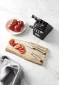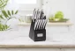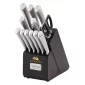 Lames en acier inoxydable. Manches texturés en acier inoxydable. L'ensemble comprend un couteau de chef de 8", un couteau à pain de 8", un couteau Santoku de 6", un couteau utilitaire de 4,5", (6) couteaux à steak de 4,5", un couteau d'office de 3,5", des ciseaux de cuisine et un bloc à couteaux en bois d'acacia tacheté de noir. Lavage à la main uniquement. Ne pas mettre au lave-vaisselle. Garantie limitée de 25 ans. 8,25" de diamètre x 4,625" de largeur x 12" de hauteur.