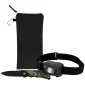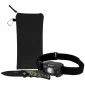 Phare rechargeable à capteur LED Wave (FL176) associé au couteau camouflage Bullseye (MK56). Le phare offre une puissance lumineuse allant jusqu'à 120 lumens, une autonomie d'environ 3,5 heures, un angle de lumière réglable et une sangle élastique pour la tête. La fonction de capteur du bouton gauche permet un mode marche/arrêt sans contact, tandis que le bouton droit active 3 modes manuels : niveaux de lumière élevé, faible et clignotant. Comprend un câble de chargement USB et un sac hydrofuge en 1000D. Le couteau en acier inoxydable 420 possède plusieurs points de préhension, un clip de poche et un trou pour dragonne. 4,5" L x 9,75" H
