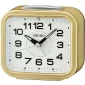 Un réveil de chevet fonctionnel de Seiko avec alarme à cloche, boîtier doré métallique, cadran blanc avec grands chiffres, Lumibrite, fonction snooze et lumière, et trotteuse silencieuse. Conforme à la proposition 65.
