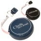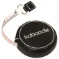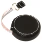 Rond, peau de vache, cuir synthétique, communiqué de presse, étui rembourré, surpiqûre d'accent, mesurer l'article, ruban de 60", verrouillage, mesure de tissu, échelle en pouces, échelle en cm. 2" de diamètre x 0,625" de profondeur.