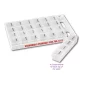 7 jours, 28 compartiments, dimanche, lundi, mardi, mercredi, jeudi, vendredi, samedi, matin, midi, soir, heure du coucher, jour de la semaine, boîte à pilules à couvercle refermable, rectangle, couvercle articulé, couvercle rabattable. 6 3/4" L x 4 3/8" L.