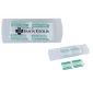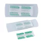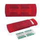 Étui en plastique givré rempli de pansements. S'ouvre pour révéler environ 5 pansements. Rechargeable avec des pansements de taille standard. Conforme à la proposition 65. 4" L x 1,625" H x 0,375" P
