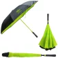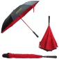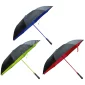 Le parapluie Skyline est doté d'un mécanisme de fermeture inversée, d'une ouverture automatique par bouton-poussoir, d'une double couche de 44" à deux tons et ventilée, ainsi que d'une poignée en caoutchouc avec un arbre en fibre de verre. Il tient debout lorsqu'il est fermé. Conforme à la proposition 65. 27,25" H x 47" de diamètre.