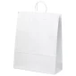 Ces sacs de magasinage en papier kraft blanc populaires sont fonctionnels, abordables et disponibles en tailles petites à moyennes. Ils sont équipés de poignées en papier torsadé assorties et d'une découpe en dents de scie sur le dessus. Conforme à la CPSIA, à la FDA et à la Proposition 65. 16" L x 6" P x 18 1/2" H
