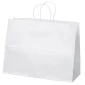 Ces sacs en papier kraft blanc populaires sont fonctionnels, abordables et disponibles en tailles petites à moyennes. Ils sont dotés de poignées en papier torsadé assorties et d'une découpe en dents de scie sur le dessus. Conforme à la CPSIA, à la FDA et à la proposition 65. 16" L x 6" P x 12" H