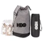 Sac à dos à bandoulière avec couverture enroulable et 2 kits de s'mores. Le sac à dos est fabriqué en polyester chiné de 600 deniers et contient un compartiment intérieur spacieux avec fermeture à cordon. Le kit de s'mores comprend 1 tablette de chocolat, 2 biscuits Graham, 4 marshmallows jet de 1/2 ou 2 marshmallows jet. 9" L x 17" H