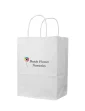Ces sacs en papier kraft blanc sont RECYCLABLES. Ce sac, avec son papier épais, ses soufflets latéraux et inférieurs et ses poignées en papier torsadé, permet de transporter une variété d'articles. Les sacs ont un fond carré et peuvent tenir debout. Couleur Jet d'encre CMJN, Impression Multicolore, Enregistrement de Couleur Parfait, et Aucun piège entre les couleurs. Zone d'impression de 3" x 2" maximum avec une couverture de 25%. 5,5" L x 3,5" P x 8" H