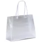 Les élégants sacs en plastique givré haute densité sont dotés de poignées en macramé, d'un dessus repliable renforcé et d'un insert en carton au fond. Conforme à la CPSIA, à la FDA, à la Proposition 65. 10" L x 4" P x 8" H