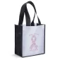 Ces sacs non tissés en PET de 80 GSM présentent des panneaux avant et arrière blancs, rehaussés de soufflets, de passepoils et de poignées noirs. Conforme à la CPSIA, au C-TPAT, à la FDA, à la Prop 65. 9" L x 5" P x 10" H