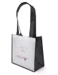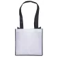 Ces sacs non tissés en PET de 80 GSM présentent des panneaux avant et arrière blancs, rehaussés de soufflets, de passepoils et de poignées noirs. Conforme à la CPSIA, au C-TPAT, à la FDA et à la Proposition 65. 12" L x 6" P x 12" H.