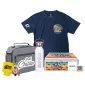Kit de détente et de relaxation. Enveloppe blanche à rabat. Baume à lèvres. Gel désinfectant pour les mains de 50 ml avec mousqueton. Carte recto verso de 4x6 pouces. Petit sac isotherme gris. Gobelet blanc satiné sous vide de 20 oz. Refroidisseur de canette jaune. Boîte blanche à couvercle bombé avec MicroMints® en forme d'étoile. T-shirt ACE pour homme en lin XL bleu marine à col rond. 12,125" L x 9,25" l x 4" H