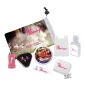 Étui en microfibre avec cordon de serrage en couleur. Mini boîtes de menthes. Les menthes sont disponibles en menthe poivrée, menthe verte, wintergreen et cannelle. Miroir de poche. Baume à lèvres. Écouteurs. Portefeuille pour smartphone en silicone. Bouteille de désinfectant pour les mains de 0,5 oz. Conforme à la CFIA, SQF. 8,875" L x 6,25" l x 2,125" H.