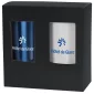 Ensemble de 2 tasses : Gobelet blanc à double paroi 1846 avec intérieur et extérieur en plastique. Couvercle transparent anti-éclaboussures. 22 oz / 590 ml. Gobelet à double paroi en acier inoxydable bleu 1991, couvercle transparent anti-éclaboussures avec languette coulissante. 18 oz / 534 ml. Avec boîte cadeau. 2 3/4" L x 6 7/8" H.