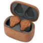 Écouteurs sans fil en bois logés dans un boîtier de recharge de 240 mAh. Musique (stéréo), appels mains libres (stéréo). Portée de fonctionnement : 33 pieds/10 mètres. Jusqu'à 3 ½ heures de lecture/temps de conversation. Temps de recharge : écouteurs - environ 1 heure ; boîtier - environ 1 ½ heures. Voyants indicateurs - Extérieur rouge pour la charge du boîtier, clignotement blanc pour la recharge des écouteurs. Comprend un câble de chargement USB Type-C et 3 embouts auriculaires de différentes tailles. Se connecte via V 5.0. Conforme à la proposition 65. 1,125" de diamètre x 2" de largeur x 1,625" de hauteur.