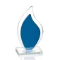 La forme de flamme en cristal bleu clair et solide est montée sur une base en cristal clair pour créer une réflexion infinie sur la surface brillamment polie du prix Flamingo. 8,0" H