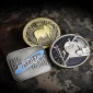 Boucle de ceinture en finition étain personnalisée avec passant de ceinture standard. Présente une forme courbée. Elle est frappante et durable. 2" L x 3" H