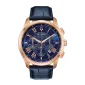 De la collection Classique. Nouveau style Wilton avec fonction chronographe à six aiguilles. Boîtier en acier inoxydable ton or rose avec des marqueurs romains appliqués, tachymètre et calendrier sur un cadran bleu foncé texturé, verre minéral bombé, bracelet en cuir bleu à motif croco avec fermoir déployant double-pression, et résistance à l'eau jusqu'à 30 mètres. Conforme à la Prop 65. Diamètre de 46mm.
