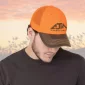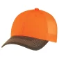 Cette casquette est fabriquée en polycoton/polyester/nylon mesh souple vieilli. Elle est à 6 panneaux, construite et ajustée (dos en mesh). Elle présente des panneaux avant laminés avec pro-stitch, une visière pré-courbée avec 8 rangées de coutures (p1) et une sangle arrière ajustable en plastique (s1).