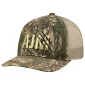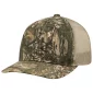 Il s'agit d'une casquette à 6 panneaux, construite, de style pro-round (avec un filet à l'arrière). Elle présente des panneaux avant et une visière supérieure en motif Realtree. Elle dispose également de panneaux avant en buckram de luxe laminé avec couture Pro-stitch, une visière légèrement incurvée, 8 rangées de couture et une sangle arrière ajustable en plastique. Elle possède une visière inférieure de couleur beige.